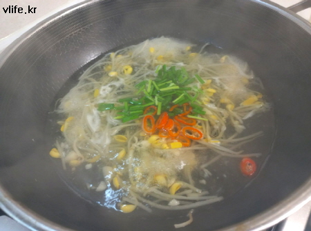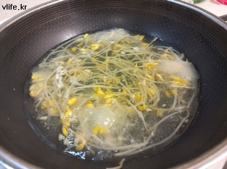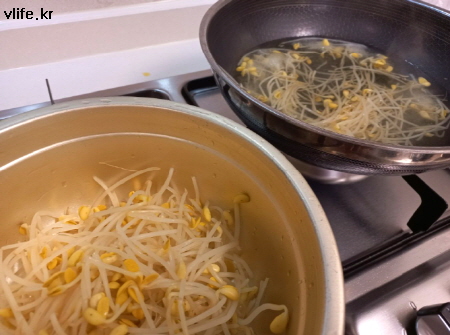냉국 국물 양만큼 물 끓여 깨끗이 씻은 콩나물 넣어 삶아요.