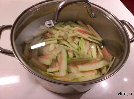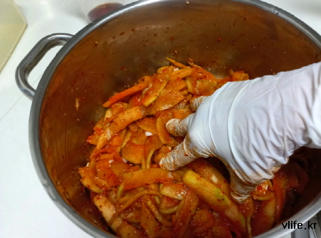 무 생채나 오이 무침 등 소금에 절였다 무치는 요리할 때 양푼보다 냄비를 사용했더니 좋더라고요.
