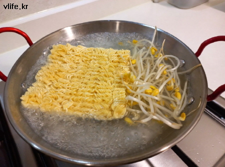 끓는 물에 비빔면 면과 콩나물 한 줌 넣어 삶아 찬 물에 헹궈 물기 빼서