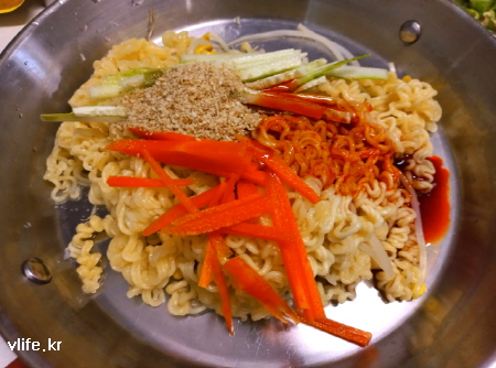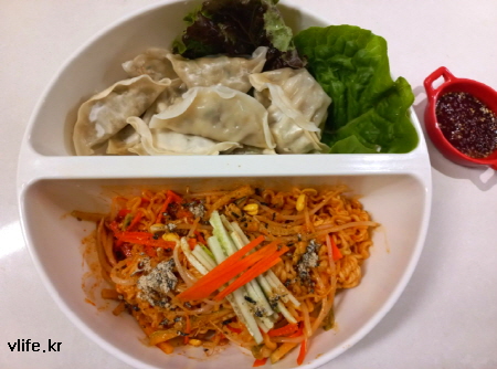 재료; 만두, 비빔면, 채소는 있으면 좋고 없으면 통과 (오이, 당근, 콩나물), 참기름과 깨소금도 선택 사항