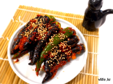재료; 가지고추, 멸치액젓, 설탕, 마늘, 고춧가루
