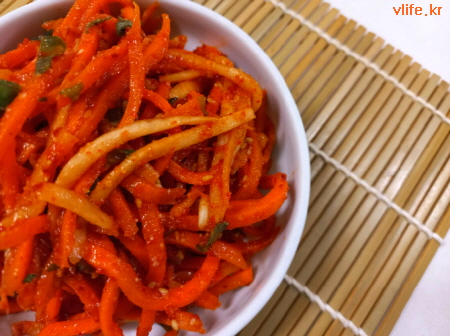 재료; 당근, 무, 파, 마늘, 고추장, 고춧가루, 설탕, 소금, 참기름, 깨소금, 파, 마늘