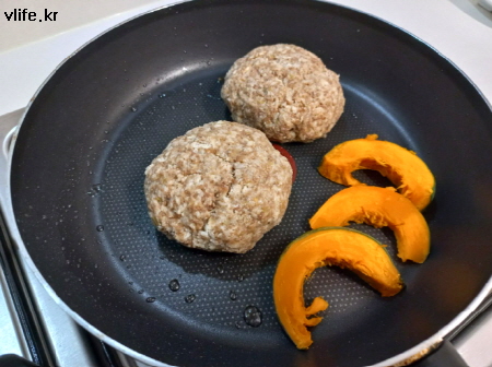 기름 두른 팬에 구우면서 빈자리에 단호박 데웠어요.
