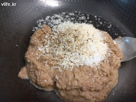 소금, 후추, 빵가루 넣고 잘 섞어요.