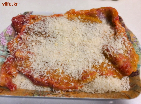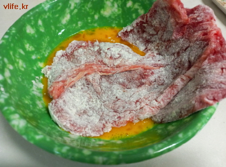 밀가루 앞 뒤로 묻히고 달걀물에 퐁당