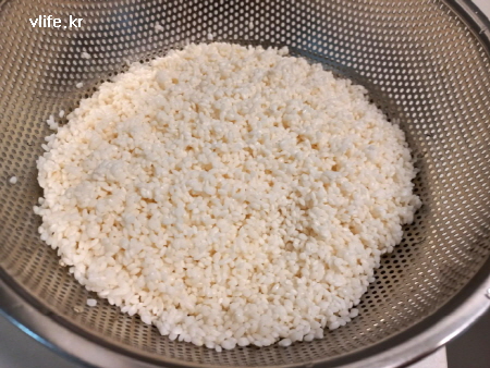 고운 체에 갈린 쌀 붓고 주걱으로 살살 긁거나 체를 탁탁 쳐 가며 고운 가루만 거르고