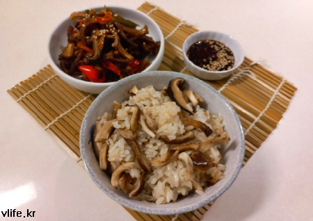 재료; 건 표고버섯, 건 버섯기둥, 쌀, 간장, 굴소스, 설탕, 청양 고추 조금, 식용유, 참기름