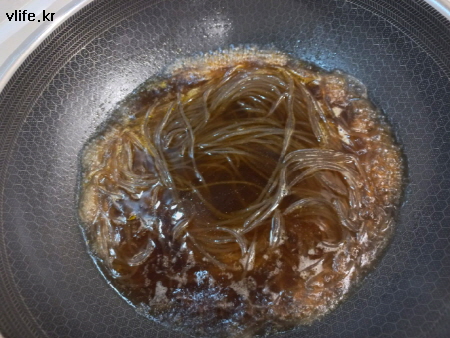 그 팬을 주방티슈로 한번 닦아 내고 당면 삶을 물 넣고 끓으면 당면 넣어 익혀요.