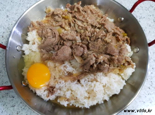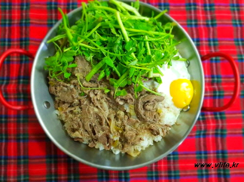 고기 듬뿍 올리고 달걀 한 알 깨뜨려 얹어