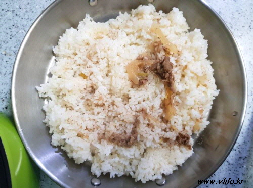 밥을 넓게 펴 올린 뒤 고기 국물 골고루 뿌리고