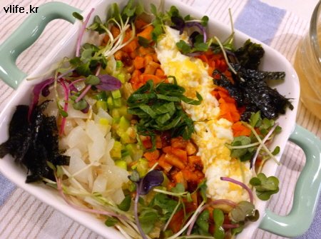 새싹 채소와 깻잎은 있어서 얹은 거예요, 없어도 맛있어요.
