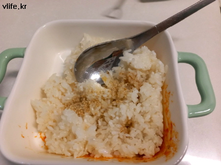 한쪽에 두었던 그릇에 밥 넣고 취향대로 간장이나 고추장, 소금 등 약간만 넣고 참기름과 깨소금 섞어 비벼 고르게 펴요.