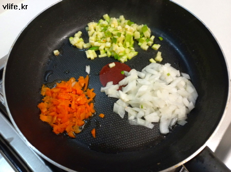 나중에 채소류 볶아야 하니까 작은 프라이팬을 사용해 데쳐서 잘게 잘랐어요.