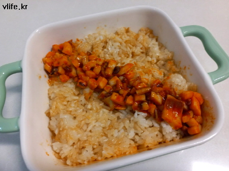 밥 담을 그릇에 오징어에 고추장+설탕+깨소금(식초 취향껏) 넣고 비벼 따로 덜어 두고, 그릇은 한쪽에 잘 모셔두고