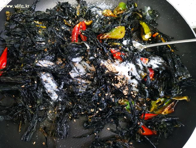 준비물; 마른미역, 건 청양 고추, 식용유, 설탕, 통깨