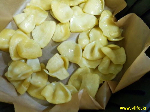 에어프라이어 용기에 유산지 깔고 고르게 편 뒤 180도에서 20여분 구우며 중간에 한두 번 뒤집어 줬어요.