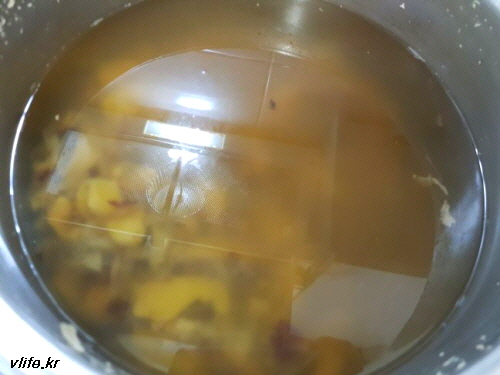 다시 붓고 30분 끓여서 고운 체나 면포에 건더기 걸러 맑은 생강차만 다시 잠깐 더 끓여요.