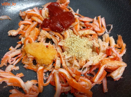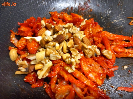 재료; 홍 진미채, 견과류, 깨소금, 마늘, 고추장, 참기름, 올리고당