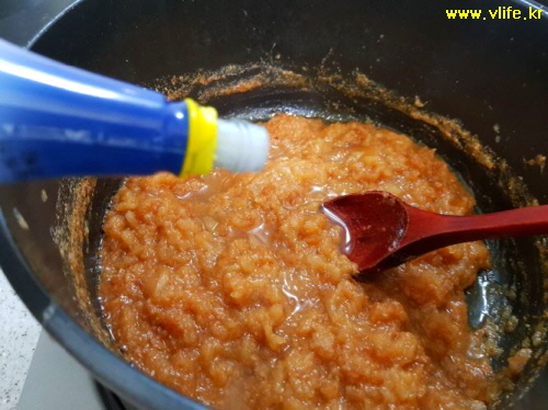 타지 않을 만큼 약간의 물과 함께 썰은 사과 넣어 무르도록 끓이다가