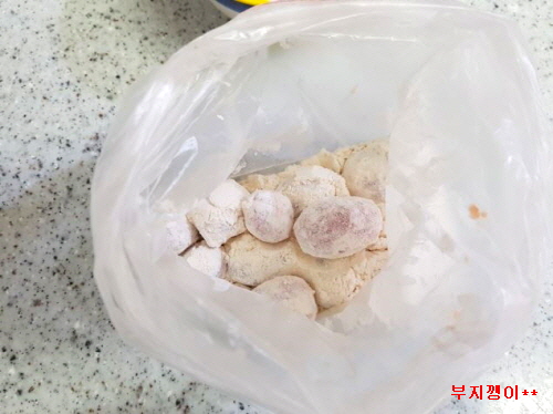 얼음물로 반죽한 걸쭉한 튀김옷에 담갔다가