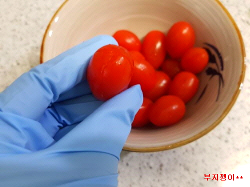 깨끗이 씻은 방울 토마토의 머리 부분에 '+' 칼집을 내요.