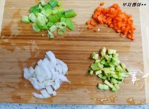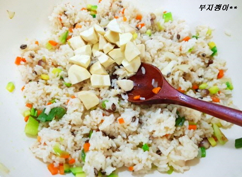 준비물; 밥, 밤, 호박, 양파, 당근, 파, 올리브유, 소금, 깨소금, 후춧가루, 참기름