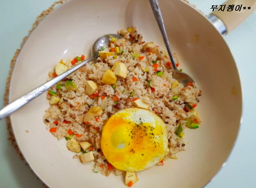 밥 넣고 상태 봐서 기름 보충해가며 볶으며 소금, 후춧가루 넣어 볶다가