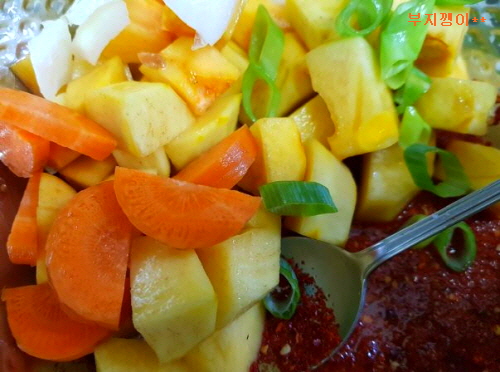 준비물; 단감, 파, 양파, 당근, 고춧가루(+청양), 마늘, 설탕, 소금