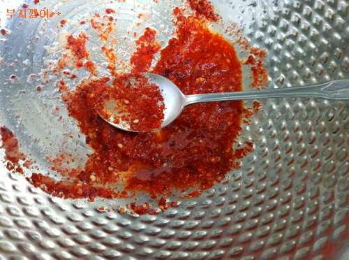 마늘, 고춧가루(+직접 믹서기에 갈아 만든 청양 고춧가루), 설탕, 소금 약간에 젓갈 대신 생수 조금 넣어 양념 만들어