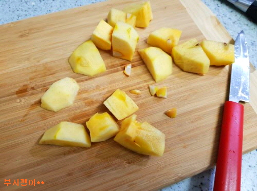 깍두기처럼 썰은 후 과도를 이용해 씨를 제거했어요.