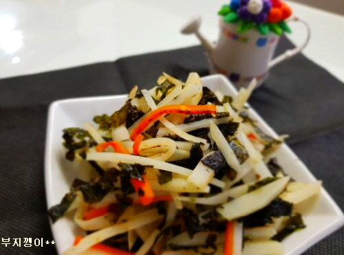 감자 볶음이 완성되면 접시에 담기 직전에 김가루 넣어 골고루 섞어요.