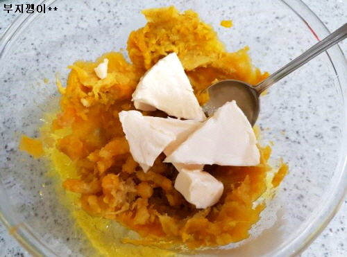 곱게 으깬 뒤 달달하게 설탕 넣어 섞고