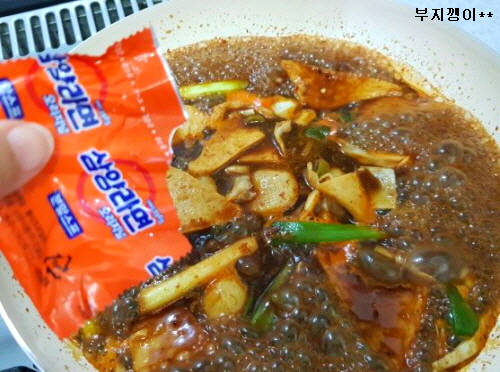 약간의 불량스러운 (?) 맛을 위해 라면스프 조금 넣어 걸쭉해지도록 저어가며 끓여요.