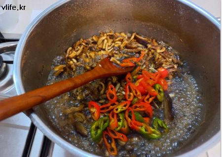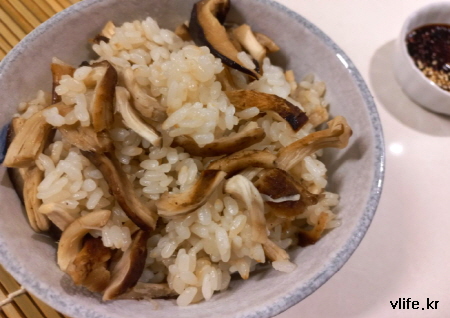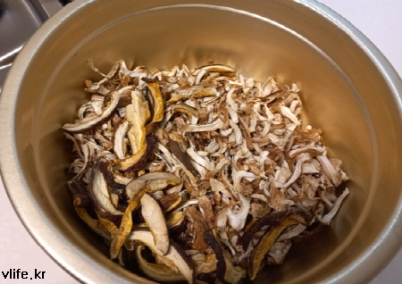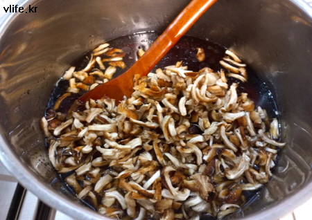 재료; 건 표고버섯, 건 버섯기둥, 쌀, 간장, 굴소스, 설탕, 청양 고추 조금, 식용유, 참기름