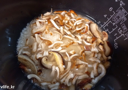 버섯 불린 물도 붓고 쌀 위에 소금 약간 넣어 조물조물 무친 버섯 올려 취사 단추 누르면 밥 짓기는 끝