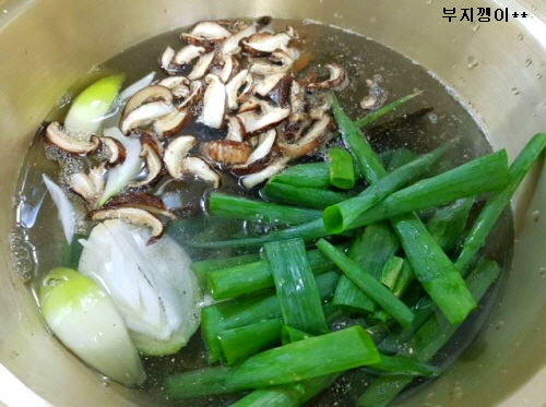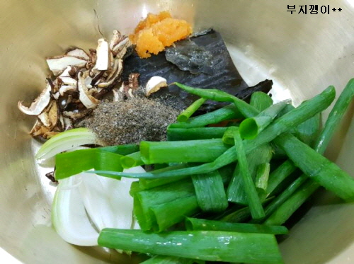 끓일 냄비나 양푼에 다시마, 건표고, 마늘, 멸치, 양파, 파, 마늘