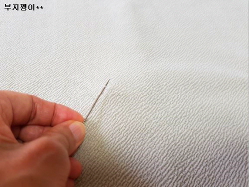 올 풀린 자리 바로 옆에 바늘을 일단 꽂아 실과 비슷한 높이로 맞춘 뒤