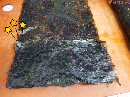 1/2 혹은 1/3을 잘라 겹쳐서 김밥을 마는데, 귀찮다고 두장을 겹쳐 말면 김밥이 질겨져서 먹기 힘들어요.