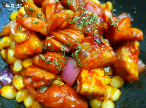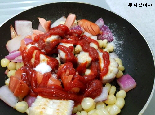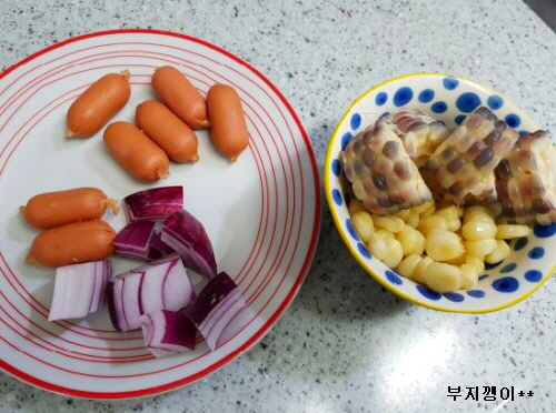 준비물; 옥수수, 소세지, 양파, 케첩, 설탕, 식용유