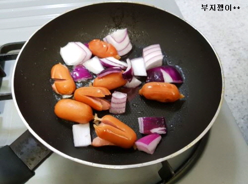 기름 두르고 소세지와 양파 잠깐 볶다가