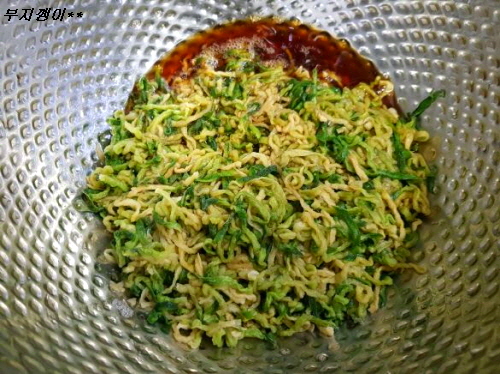 파, 마늘, 고춧가루, 물엿, 깨소금, 참기름에 간이 혹시 부족하면 소금이나 간장 조금 더 넣고 골고루 무쳐요.