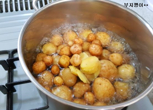 작은 감자, 얇게 썬 생강 넣고 물 부족해 보여 조금 보충