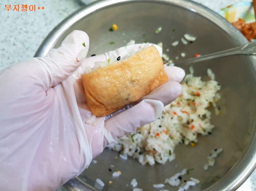 준비물; 유부 초밥 재료(꼭! 삼각형), 닭꼬치, 밥