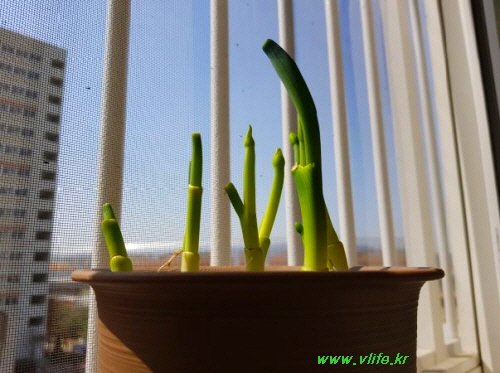 화분에 심어 놓은 파 뿌리가 자라 꽃이 피었지 뭐에요.