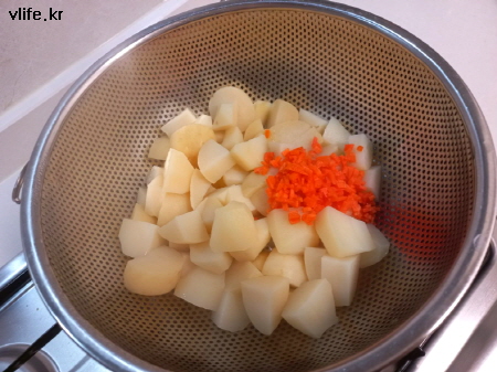 빨리 익도록 껍질 벗긴 감자를 작게 썰어 쪘어요.