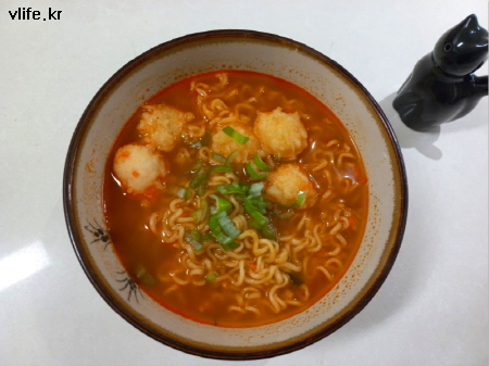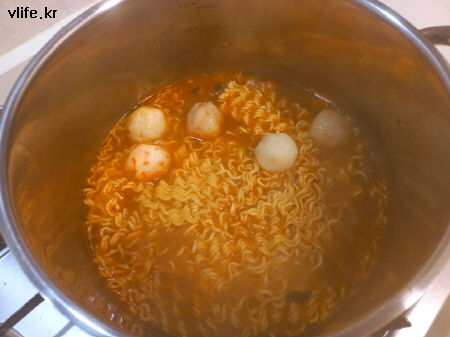 설거지 거리 줄이기 위해 라면 삶을 냄비를 사용했어요.