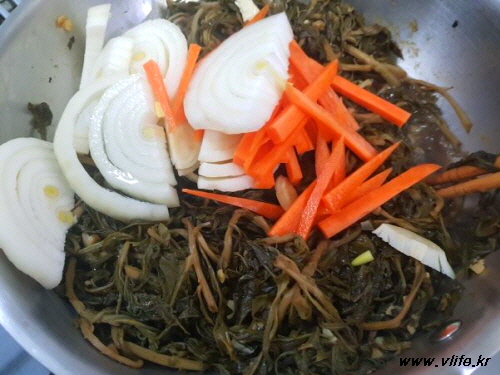 약간의 국물을 위해 생수 조금 붓고 뚜껑 덮어 잠깐 익힌 뒤 양파, 당근, 파 넣고 볶다가 깨소금 넣어 마무리.