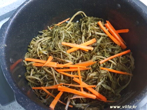 들기름+식용유에 간장과 후춧가루, 마늘 넣어 무친 뒤 볶아요.