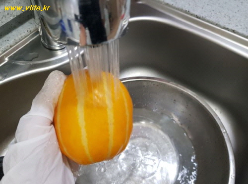 모든 과일은 껍질 벗기기 전에 물로 세척해요.
