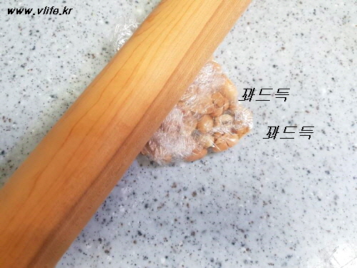 껍질 벗긴 땅콩은 랩이나 일회용 봉투에 담아 밀대로 힘주어 밀면 굵게 으깨져요.